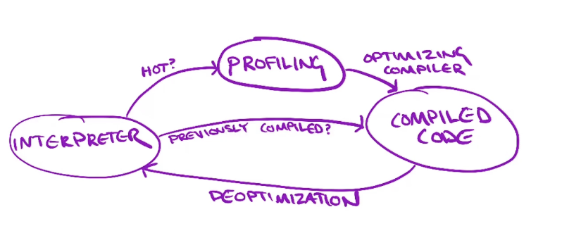 - Interpreter : Just executes the instructions and while running, it profiles to observe if a function is hot. And it detects if a function has already been JIT compiled, executing native machine code instead of interpreting instructions.